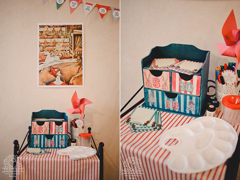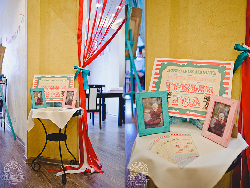 Мама Гриши - Настя - задумалась над этим праздничным днем заранее и заказала нам декор за месяц. Семья у Гриши творческая, молодая и активная. Мы долго выбирали тематику, и, в итоге, все аргументы были за винтаж и Цирк-шапито. Хотелось ярких красок и много интересных деталей.