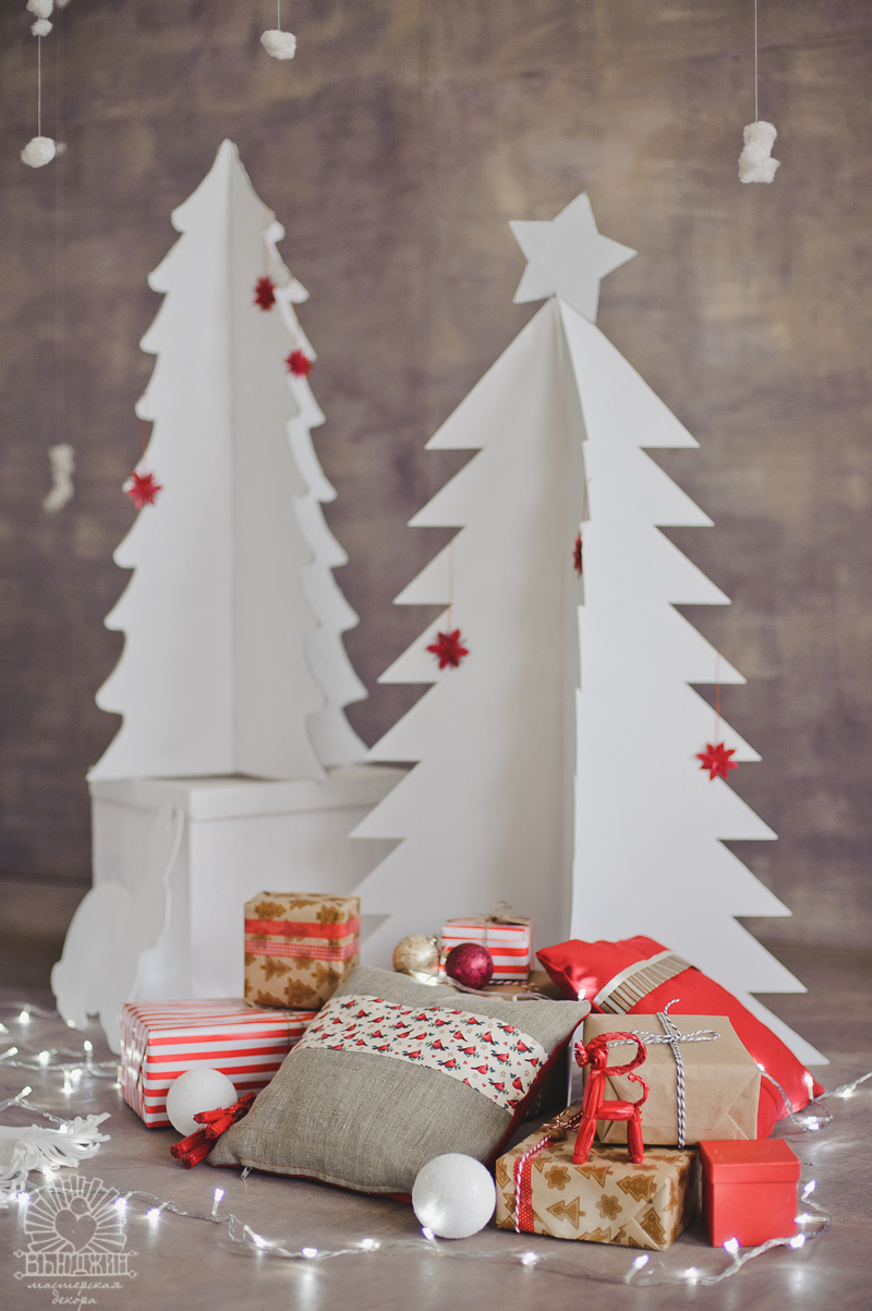 Елки и новогодние фигурки сделаны из картона, они очень удобные в транспортировке и оригинально смотрятся не только на фотосессии, но и в декоре дома.
