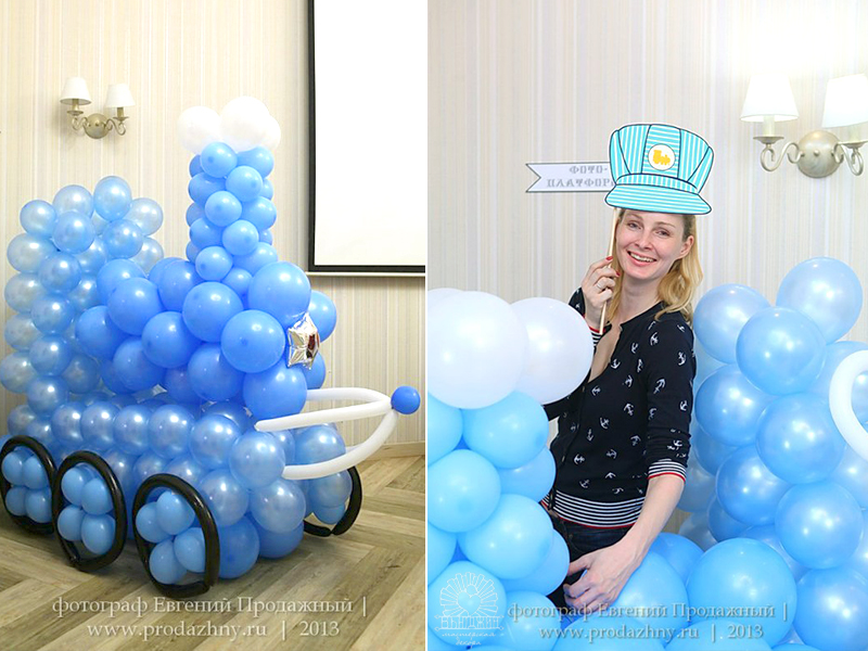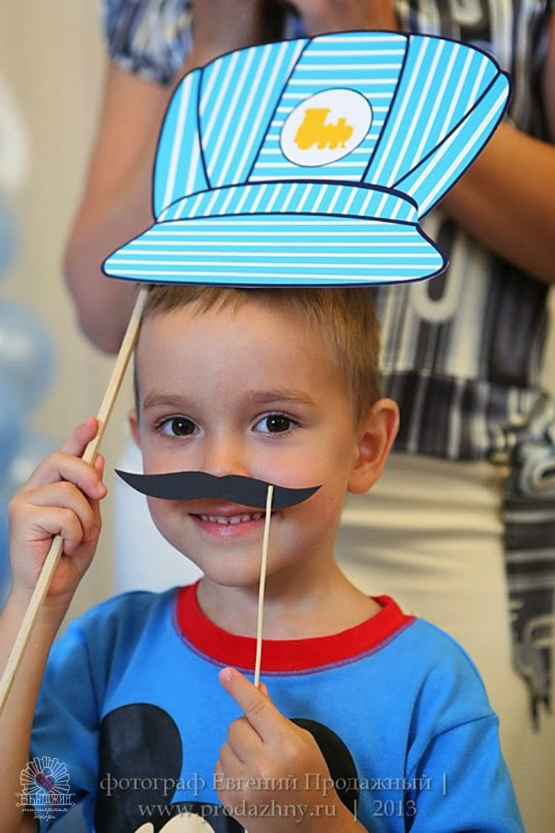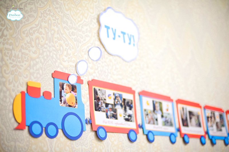 В зоне фотобудки организаторами был установлен большой паровозик из шариков, а мы сделали фотоаксессуары и указатели. Специально для именинника мы заказали именную футболку с паровозиком.