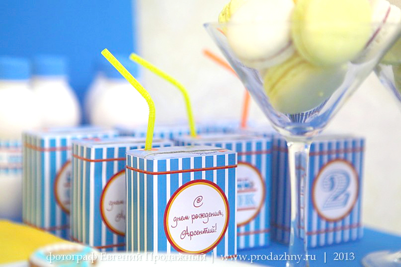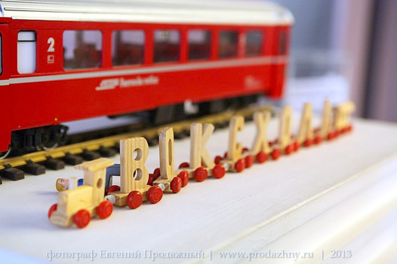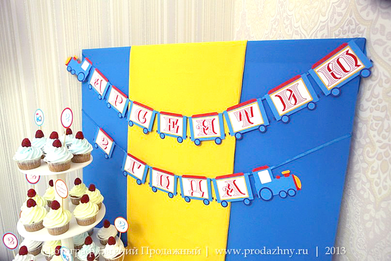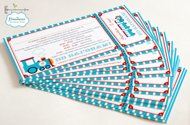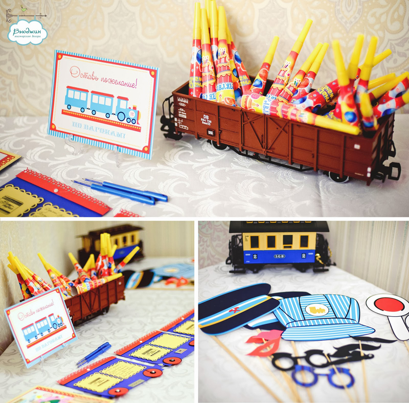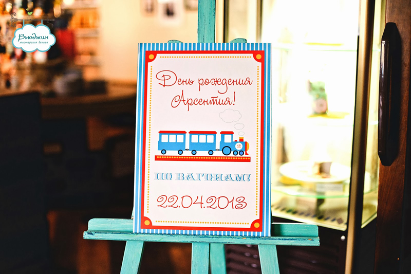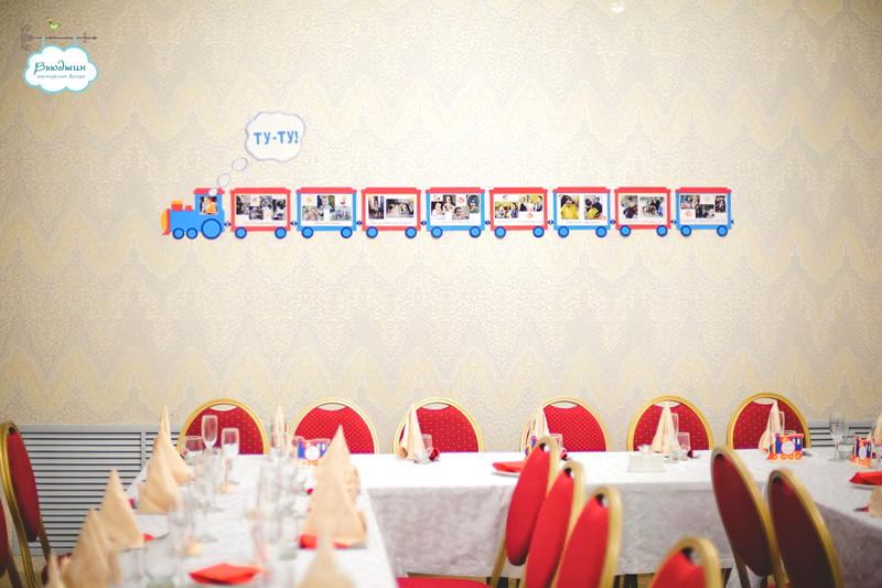 Сам банкет проходил в отдельном малом зале, который требовал яркого детского декора. Приглашения на праздник были разработаны в стиле билетов на поезд.