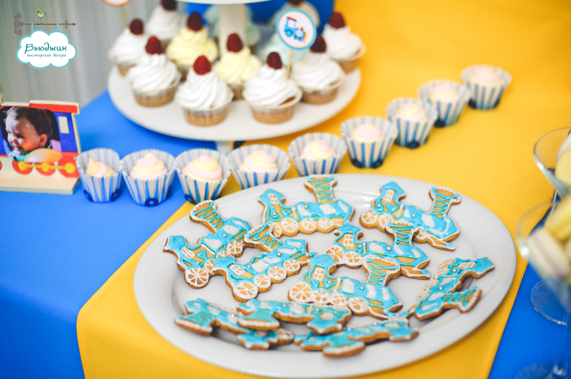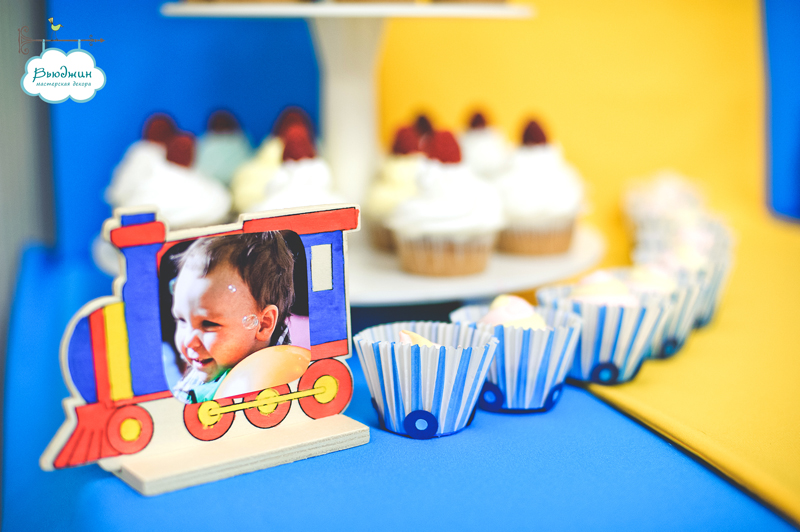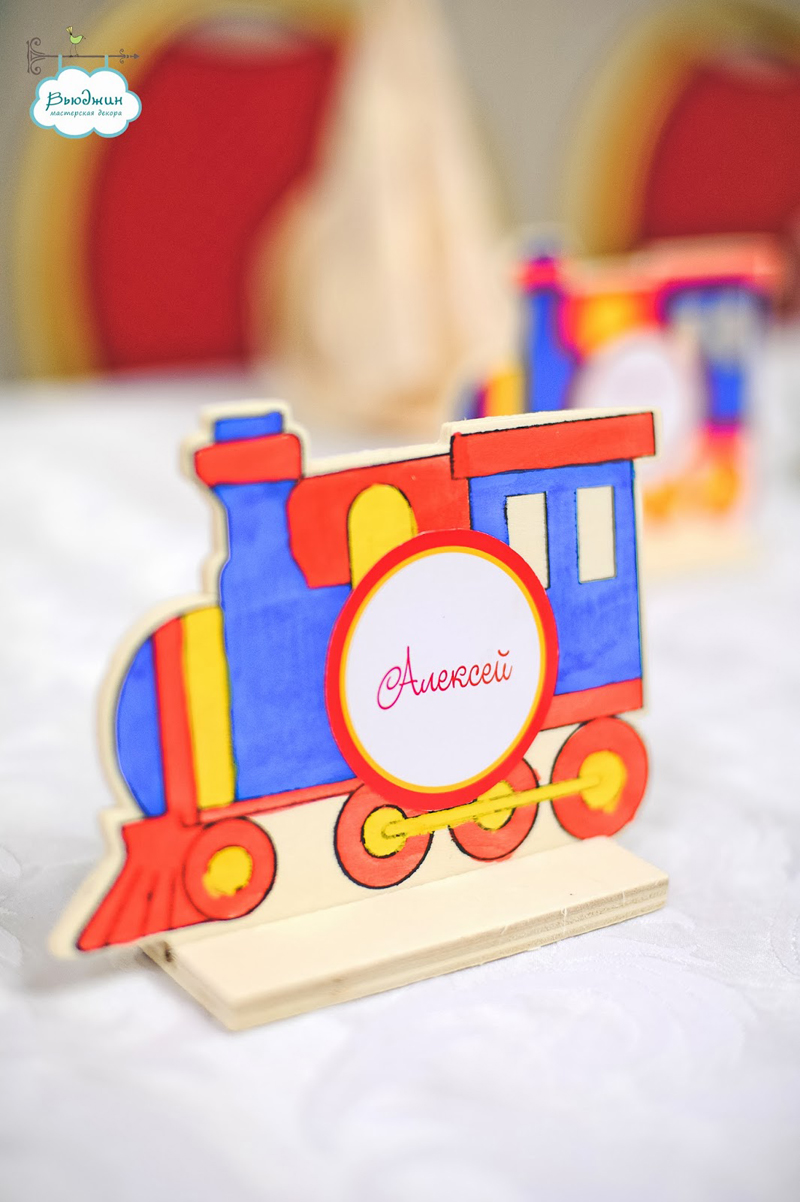 Украсили и сервировали праздничный стол, в качестве рассадочных карточек использовали деревянные паровозики, которые раскрасила сама мама Арсентия.