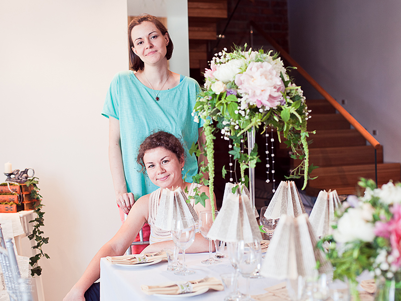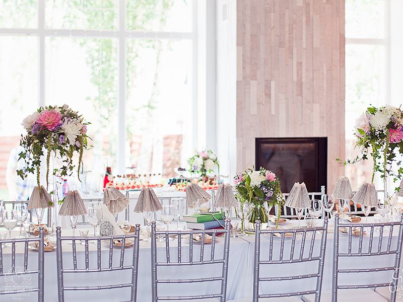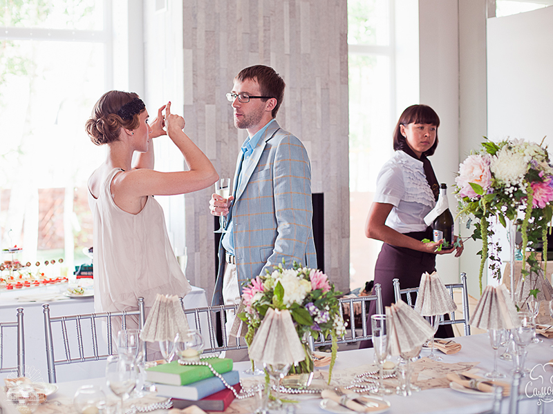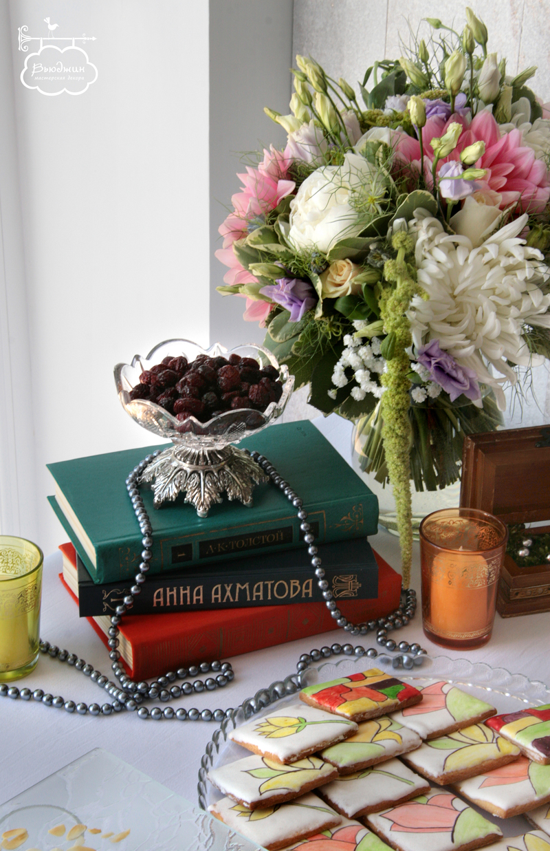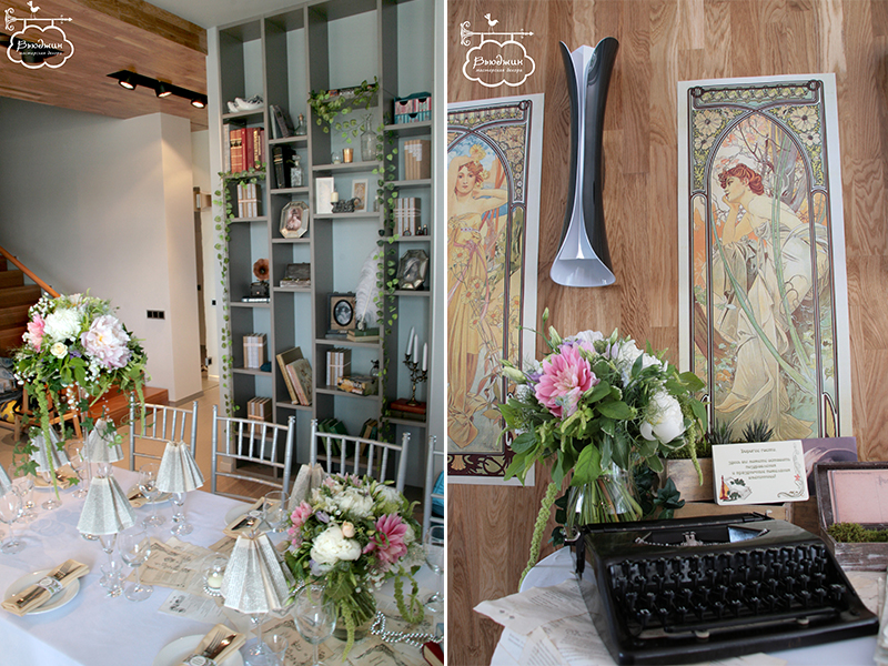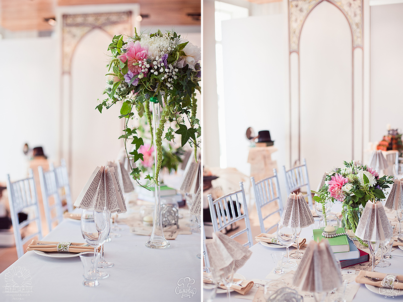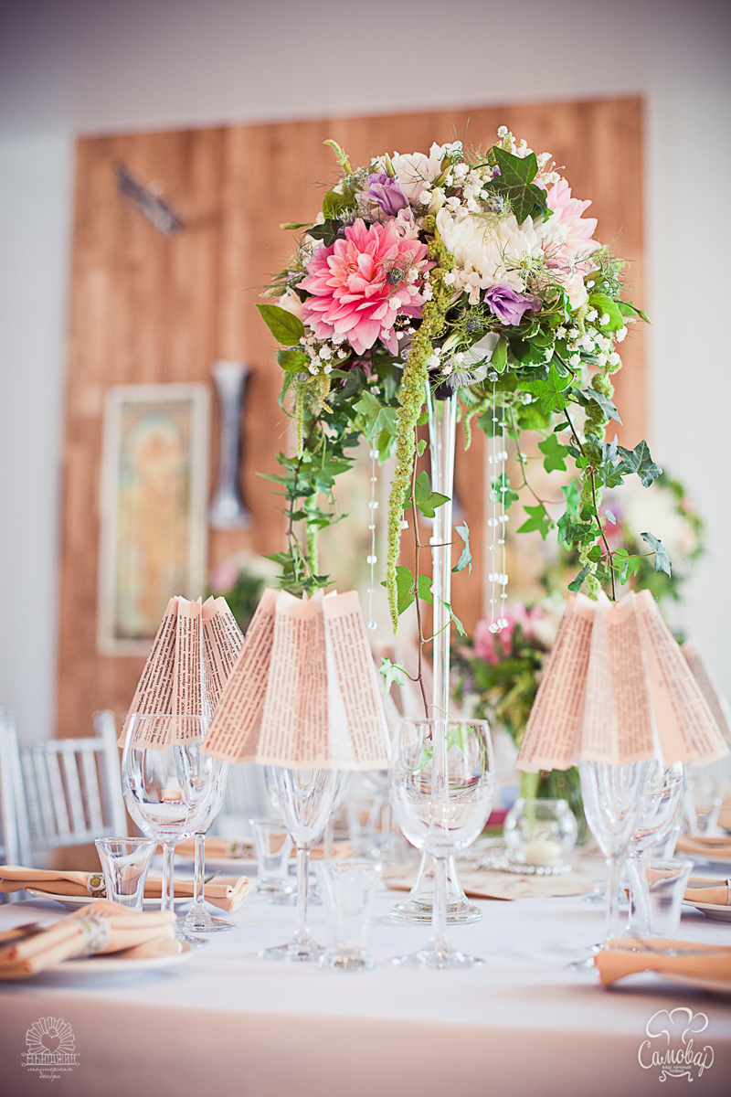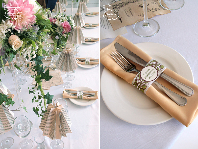 Первым делом, мы оформляли праздничный стол. Центральная композиция: раннер из состаренных листов со стихами поэтов Серебряного века, книги, свечи, жемчужные нити. Цветочные композиции в высоких вазах. Каждый бокал был стилизован под бумажный абажур, для каждого гостя пошита индивидуальная салфетка.