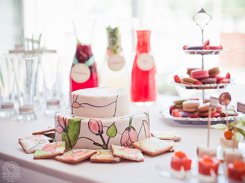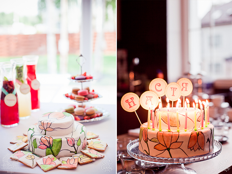 Торт и печенья на сладкий стол заказали с витражным рисунком в стиле Тиффани, фуршетные закуски украшали топперы с рисунками Альфонса Мухи, на всей полиграфии использовался растительный орнамент в стиле Ар нуво.