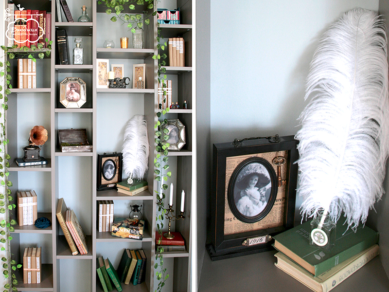 Книжный стеллаж мы заполнили книгами в декоративных переплетах и стилизованными под начало века фотографиями именинницы.