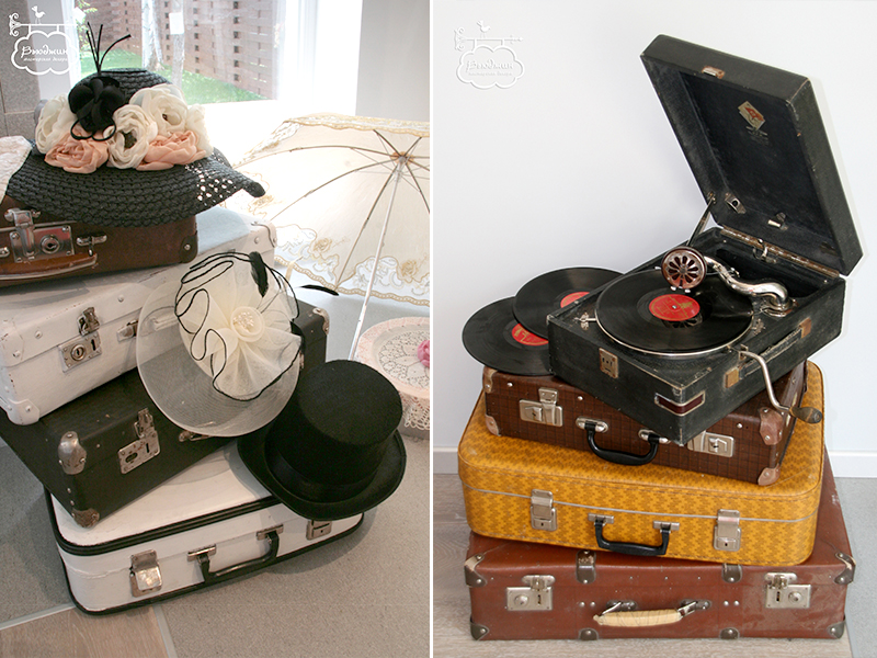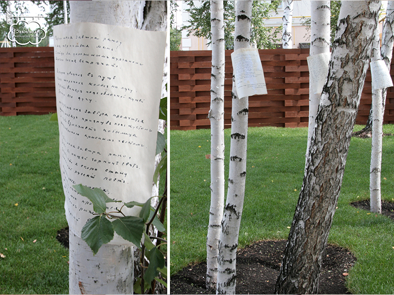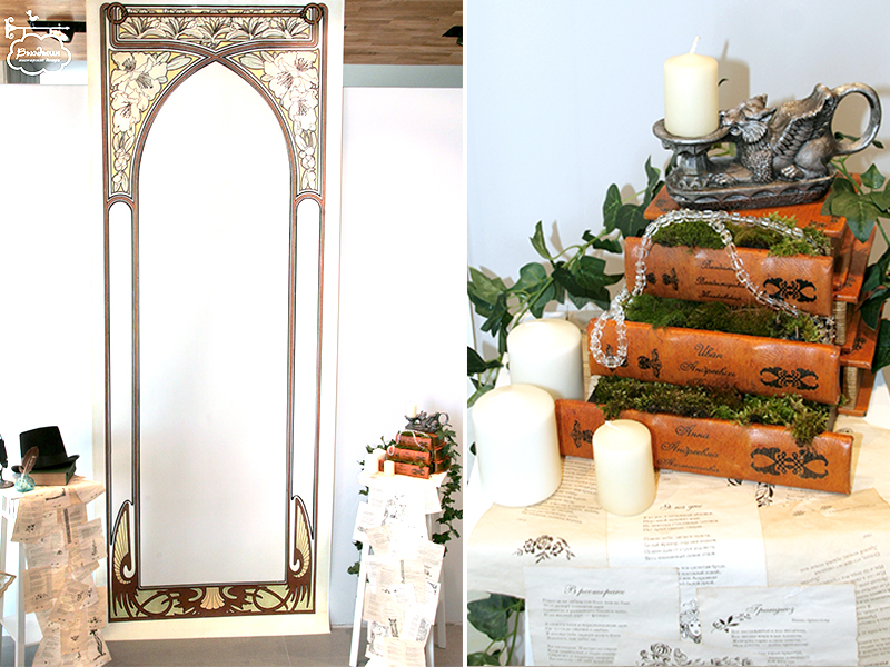 Фотозона была задекорирована баннером в стиле рисунков Альфонса Мухи. Для гостей мы приготовили винтажные аксессуары: шляпки, цилиндры, кружевные перчатки и зонтик. А еще для развлечения можно было послушать настоящие виниловые пластинки на старинном патефоне. А в саду на березках можно было найти черновики стихов Есенина, Ахматовой, Блока.