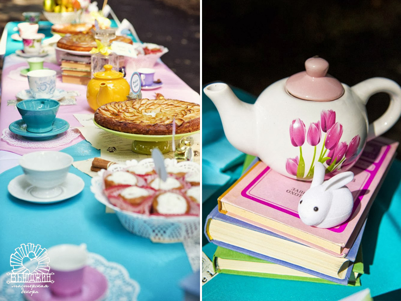 Мы накрыли несколько столов для пресс-конференции в стиле Безумного чаепития. Приглашенные актеры исполняли роли персонажей сказки.