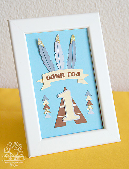 - Это объемная открытка с индейскими атрибутами, цифрой 1 и подписью.